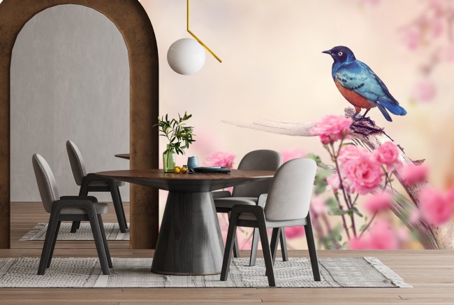 Flores rosadas Fotomurales Pájaro azul Papel Pintado Dormitorio de las niñas Foto Decoración para el hogar