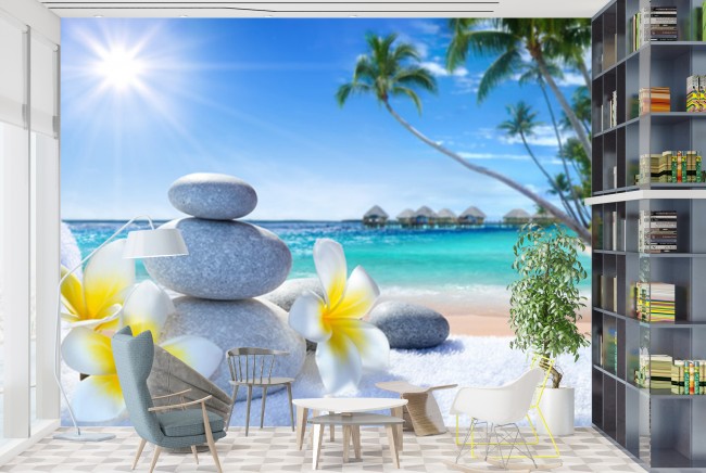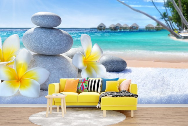 Flowers & Pebbles Beach Wallpaper Wall Mural