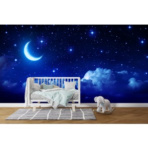 Crescent Moon, Clouds & Stars Wallpaper Wall Mural