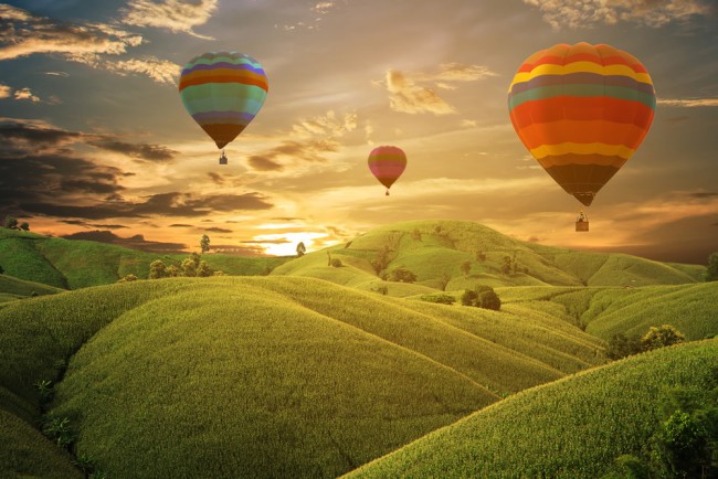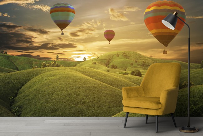Hot Air Balloon Sunset Green Hills Wallpaper Wall Mural