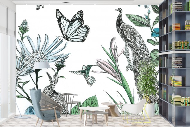 Peacock and Flowers Wall Mural by Amelia Ilangaratne