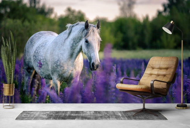 White Horse Purple Flower Field Wallpaper Wall Mural